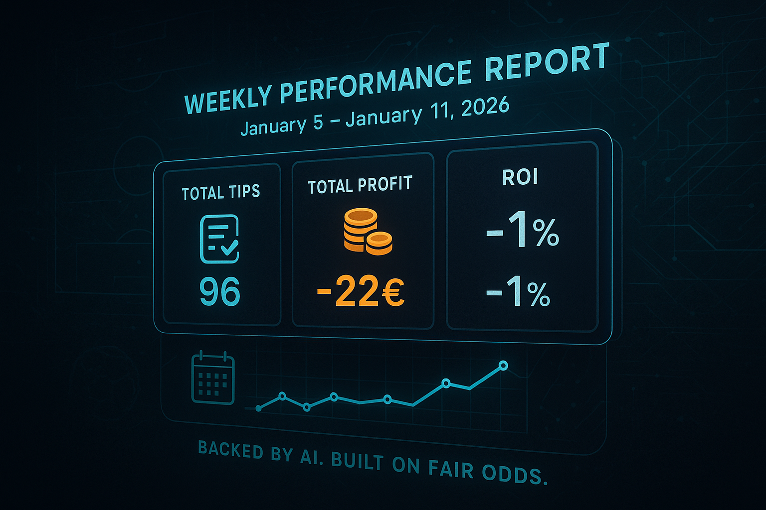 During the week of January 5 to January 11, 2026, we provided a total of 96 tips. Unfortunately, the week did not yield favorable results, as we ended with a profit of -22€ and an ROI of -1%. While this may seem disappointing, it’s crucial to analyze the results within the context of our overall strategy and long-term approach.