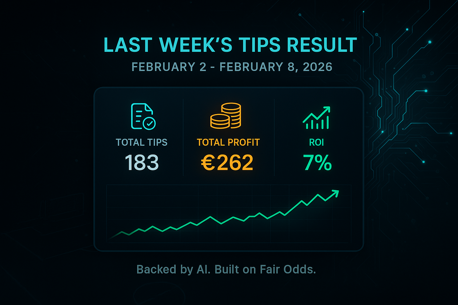 Over the past week, we provided a total of 183 tips with an impressive profit of €262, resulting in a return on investment (ROI) of 7%. This consistent performance reflects our commitment to a systematic approach to sports betting backed by advanced AI and machine learning.