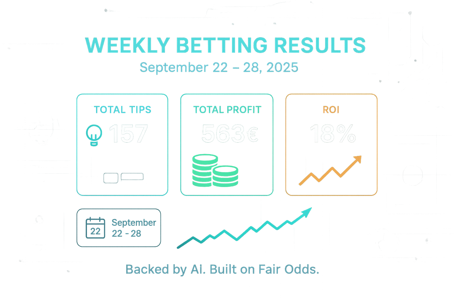 The week from September 22 to 28, 2025, proved to be a lucrative period for our subscribers at fairodds.ai. We provided a total of 157 betting tips during this week, leading to a significant profit and a considerable 18% ROI. Let’s break down the results to see how well our predictions performed.